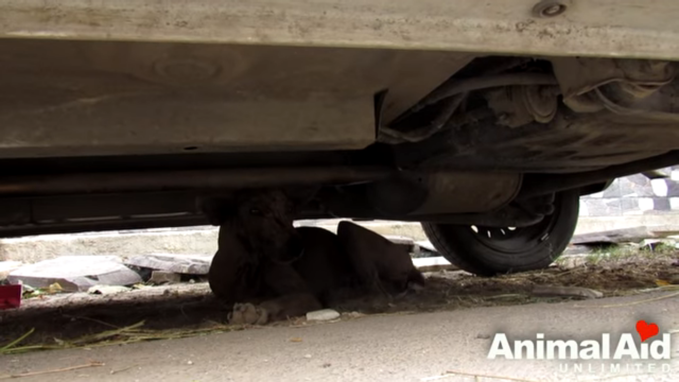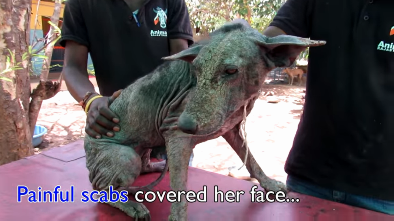 The team from Animal Aid Unlimited responded to the call and went to rescue the dog. When they approached her, she crawled out from under the car to greet them. Once she was out, the rescuers could see that she was completely bald, and had scabbing on all her face. They quickly scooped her up and took her with them for treatment.
