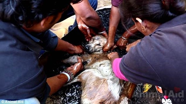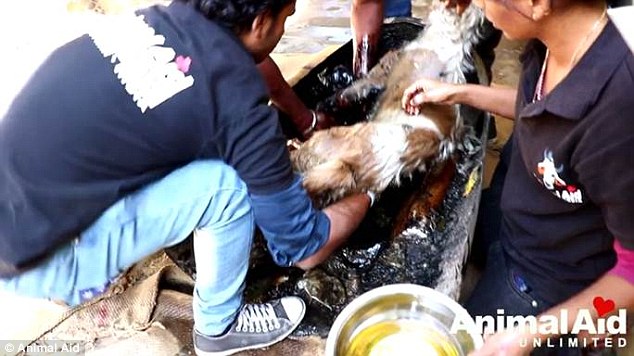 When they found her she was no longer struggling and seemed to have completely given up all hope. After giving her water to quench her raging thirst, vegetable oil was poured over the rock solid tar to soften it.