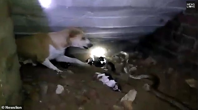 In the video, the mother dog can be seen protecting her puppies by barking at the cobra as the snake tries to attack the helpless puppies. The large cobra continued to strike at one of the puppies and left two puppies in an unconscious state.