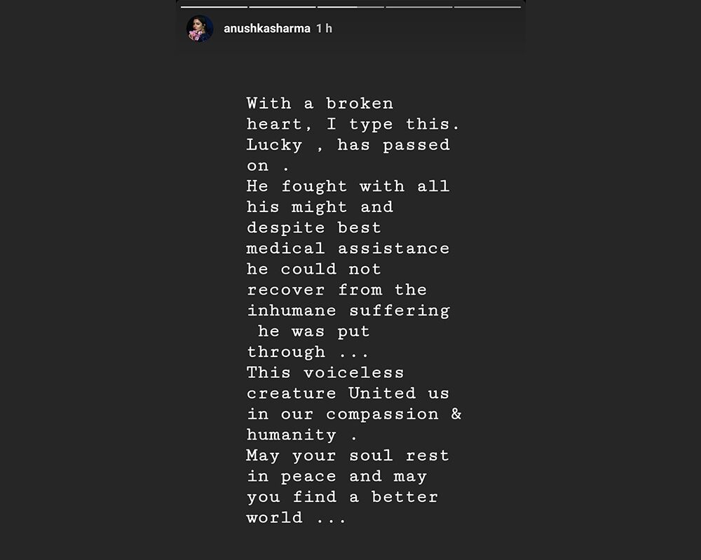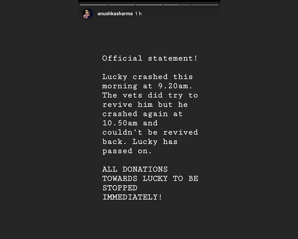 A crowdfunding campaign was set up for Lucky’s treatment. Anushka in an official statement released via her Instagram story told people to stop sending donations for Lucky’s treatment as he is no more.