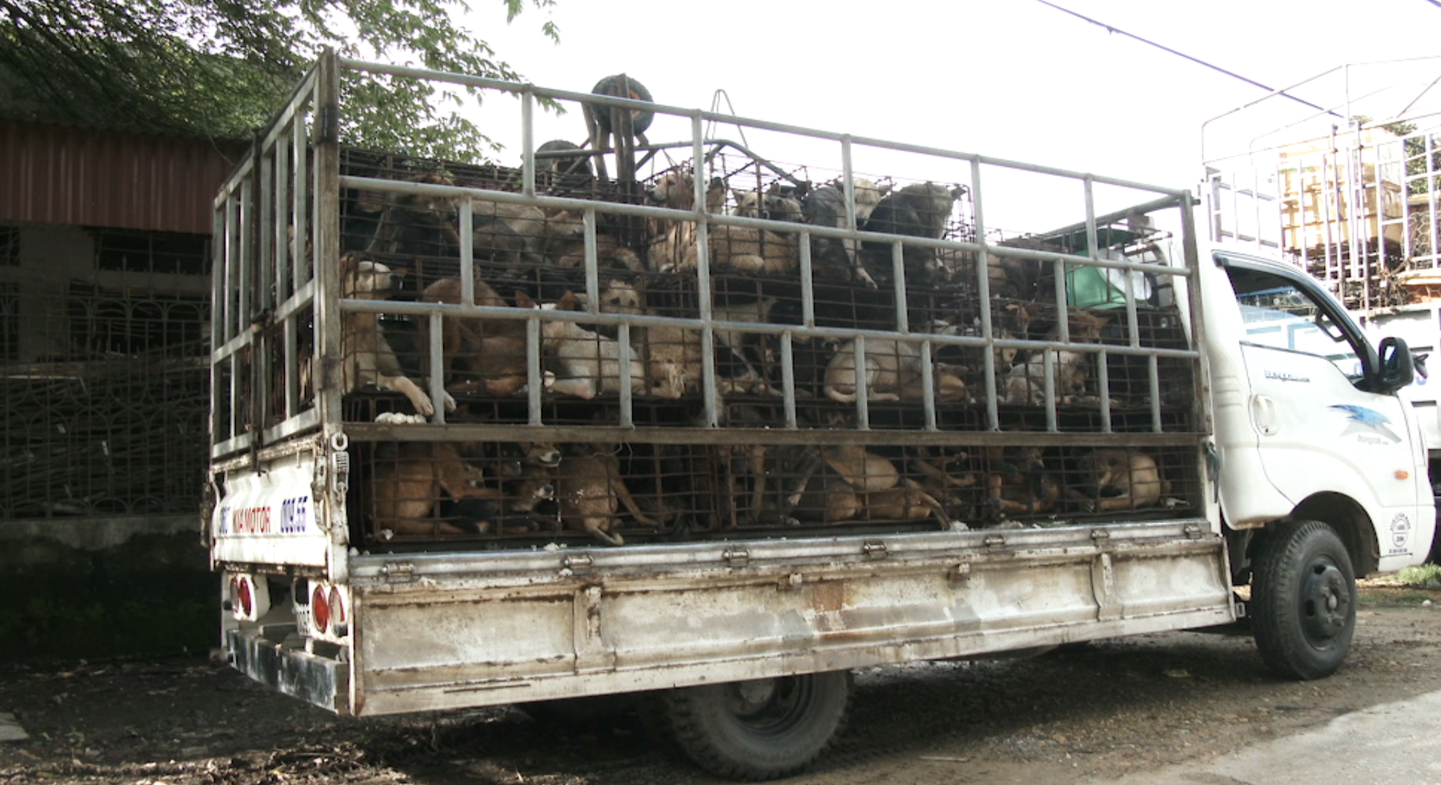 Dogs are transported in a very inhumane way. They are put in cages. Each cage carries around 10 dogs. Cages are stacked up 6 high and 3 across and then delivered to every region in Vietnam by 5-10 tons trucks. Dogs endure heat, hunger and dehydration in cramped conditions. Some dogs even fight and bite each other for more space. They are already seriously wounded upon arriving slaughterhouse. To maximize the profit, dogs are force-fed to fatten their meat, usually through a feeding pipe down the stomach. Dog meat traders hold dogs with clamps. They can do nothing but moan for help.