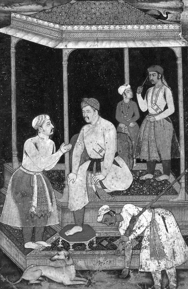 In a painting in the Baburnama, which depicts Khusrau Shah (the Indian emir who became general of the Mughal army and commanded the left wing of Emperor Babur’s army in the Battle of Khanwa) paying homage to Babur, we see a Tazi dog, which is originally from Afghanistan. In another painting from Emperor Jahangir’s time, two greyhounds feature.