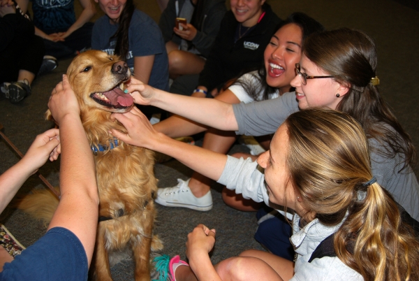 Students were free to pet, cuddle and chat with seven to 12 canine companions during the sessions. They also filled out questionnaires immediately before and after the session, and again about 10 hours later.